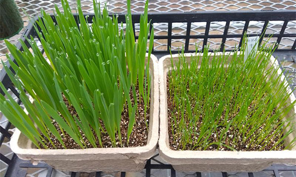 猫草(キャットグラス)で比較してみました。写真向かって左がA社キャットグラス、右が有機キャットグラス
